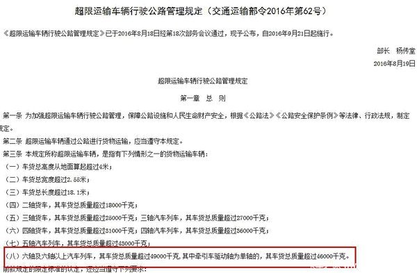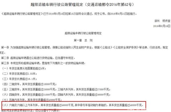 49吨与46吨在最新的《超限运输车辆行驶公路管理规定》同样进行了调整,第一章第三条就规定“六轴及六轴以上汽车列车,其车货总质量超过49000千克,其中牵引车驱动轴为单轴的,其车货总质量超过46000千克”。