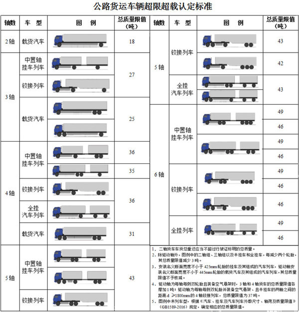 造成这一变化的主要原因是超载超限认定标准的统一,6X4六轴车49吨与6X2六轴车46吨的总重差别,相比于从前6X4的55吨少拉6吨,6X2六轴车少拉9吨,这一政策的出现直接影响了司机的切身利息。很多卡友会问为何出现49吨与46吨差距,46吨是怎么计算出来?这就要从制造源头GB1589中说起。