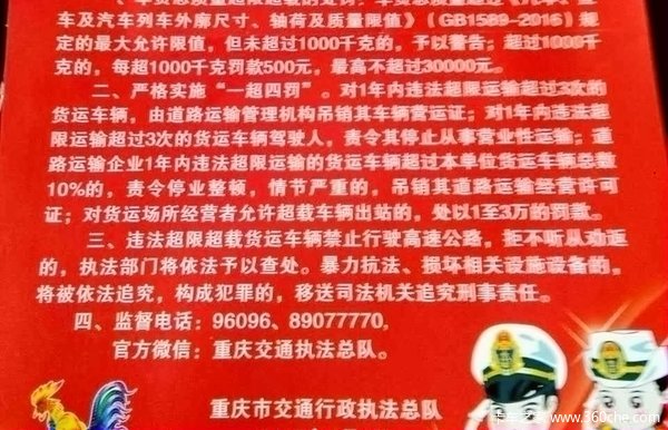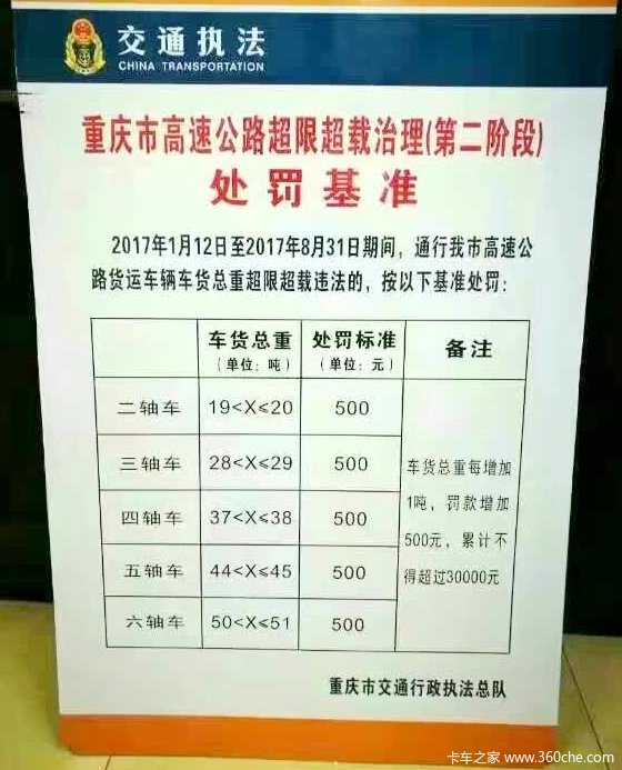 近日,接卡友爆料,重庆交通执法总队将开始新一轮的治超动作。在去年第一波治超方案(渝交委[2016]23号)超载超限整治方案中指出,卸载教育为主,处罚为辅的阶段于2017年1月11日结束,1月12日开始进入新的阶段。简单的理解就是,新一轮的治超将在1月12日开始动真格,罚款扣分不来虚的。