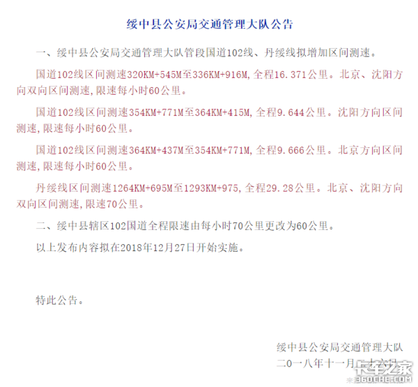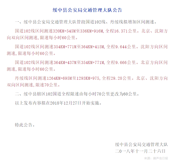 12月27日起,国道102线、丹绥线拟新增加四处区间测速。