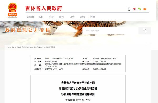 来卡车之家App【卡车之家 原创】2018年12月10日,,为进一步加强非洲猪瘟防控工作,有效切断非洲猪瘟传播渠道,吉林省人民政府发布了《关于禁止使用餐厨剩余物(泔水)饲喂生猪和加强动物运输车辆备案监管》的通告。