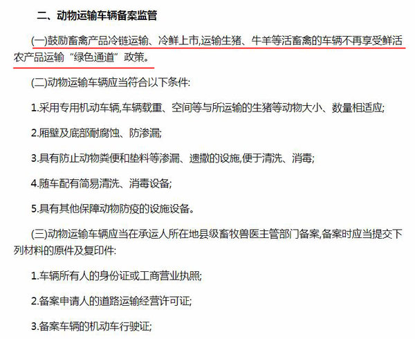 通知中明确道,鼓励畜禽产品冷链运输、冷鲜上市,运输生猪、牛羊等活畜禽的车辆不再享受鲜活农产品运输“绿色通道”政策。