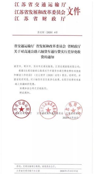 【卡车之家 原创】近日,江苏省交通厅、发改委、财政厅联合发布《关于对高速公路六轴货车通行费实行差异化收费的通知》。