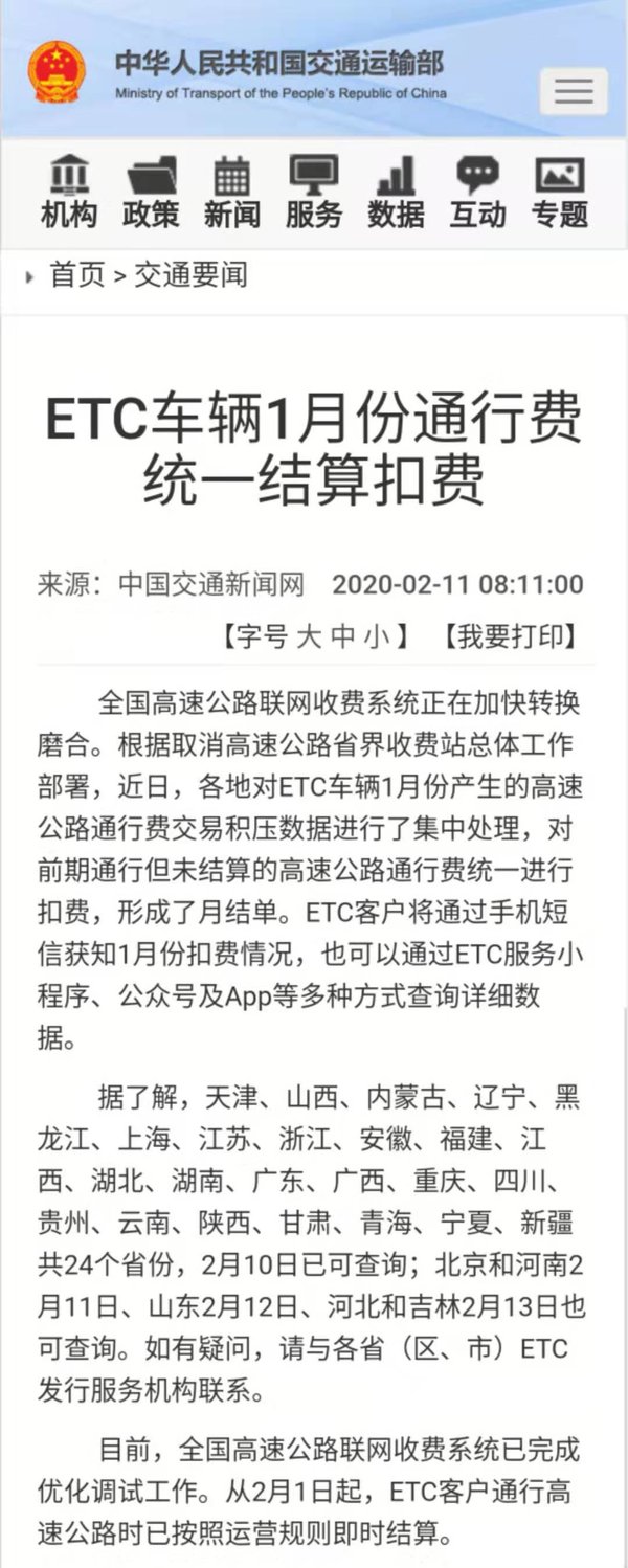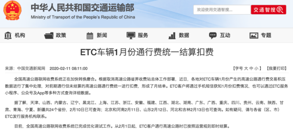 【卡车之家 原创】2020年2月11日,中华人民共和国交通运输部发布了关于《ETC车辆1月份通行费统一结算扣费》的最新消息。消息针对ECT车辆1月份通行费结算扣费的日期进行了详细的说明。
