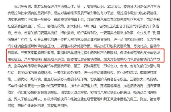 会上,吴忠琼表示要落实取消限制政策。取消对汽车通行过程中的各种不合理限制,保证全省范围内皮卡车进城限制措施、汽车尾号限行措施取消到位。