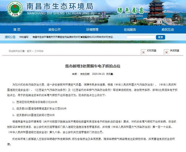 为加大机动车污染防治力度,进一步改善南昌市环境空气质量,保障市民身体健康,根据《中华人民共和国大气污染防治法》、《中华人民共和国道路交通安全法》、《江西省大气污染防治条例》及《江西省机动车排气污染防治条例》等法律法规规定,结合我市实际,新增3处黑烟车电子抓拍点位,用于抓拍柴油货车机动车尾气排放不达标违法行为。现将抓拍点位公示如下: