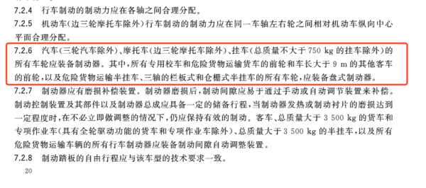 从第5.11条标准我们得知,最高车速大于或等于90km/h的牵引车辆转向轴的所有转向车轮应安装盘式制动器。也就是说,对于车企来说,其新生产的大部分车型都需要配备至少1轴的盘刹了。