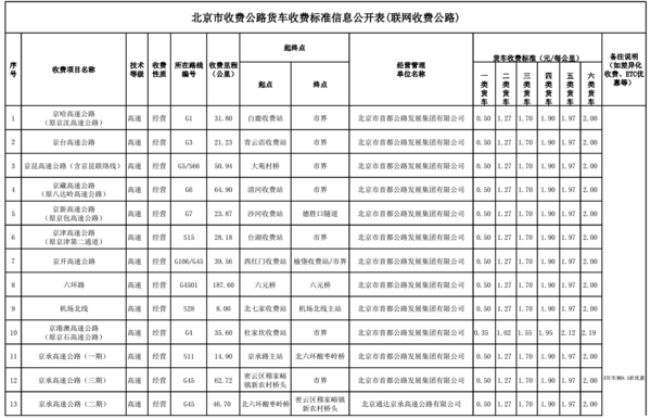北京市货车收费标准公示表1: