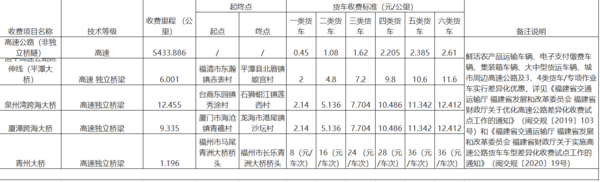 近日,福建省交通运输厅发布了最新的高速公路收费标准,具体如下。