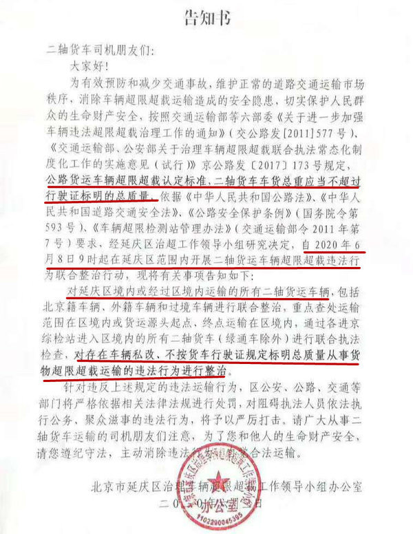 近日,北京市延庆区治理车辆超载超限工作领导小组办公室发布告知书:从2020年6月8日开始,延庆区严查所有过境两轴车,两轴车按行驶证打核载。