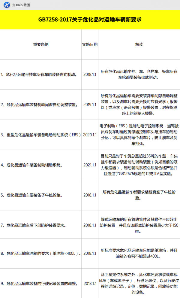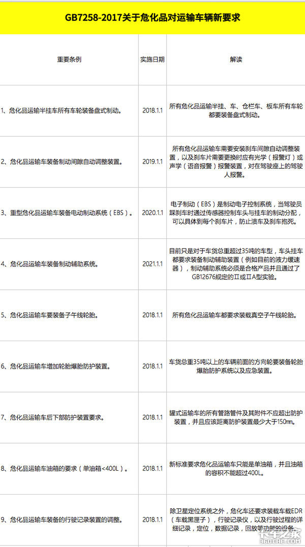 以上为《GB7258-2017》中关于行车安全性方面的条例,可以看出,《GB7258-2017》对于制动系统安全以及车辆的防护和紧急情况突发事件预防方面作出了多方位的全面改动,意在整体提升危化品运输车的行驶安全性。