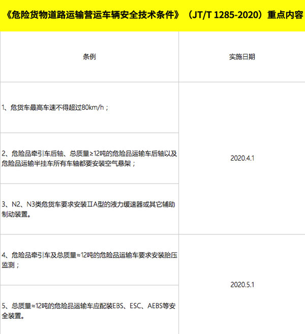 而除了以上条例外,新的《JT/T 1285》针对危化品车的内容也明确说明: