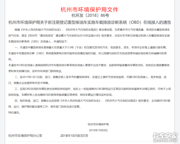 杭州:2018年10月杭州市环境保护局印发《杭州市环境保护局关于对新注册登记重型柴油车实施车载排放诊断系统(OBD)在线接入的通告》。