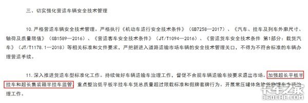 2018年6月交通部印发的《道路运输安全生产工作计划(2018—2020年)》中,再一次提到,将加强超长平板半挂车和超长集装箱半挂车监管,重点整治低平板半挂车车货总质量超过限载标准和假牌套牌行为。
