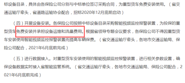 另外,根据《广东省重型货车安装使用智能视频监控报警装置工作方案》,视频监控设备由保险公司按照中标设备目录采购智能视频监控报警装置,为投保的重型货车免费安装并承担设备运维和流量费用。各保险公司不得因重型货车安装使用智能视频监控报警装置而提高车辆保费。