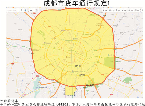 外地籍货车,每日6:00至22:00禁止在成都绕城高速(G4202,不含)以内和高新南区绕城外区域[成都绕城高速(G4202,不含)以南、剑南大道(含)、天府五街(含)、天府大道中段(含)、天华二路(含)、世纪城南路(含)、世纪城路(含)、世纪城东路(含)、科华南路(含)合围区域]内的所有道路行驶。