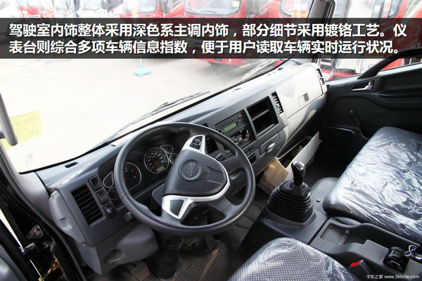 江淮帅铃品系中驾驶室内饰色调多以黑色格调为主,并且多处采用镀铬工艺,质感相对较好。