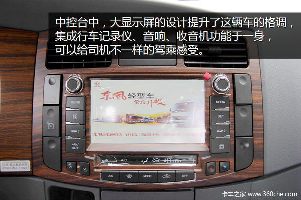 驾驶室内还是以灰黑色调为主,搭配以仿桃木装饰。方向盘设计简洁,上下可调。仪表盘右侧圆盘仅显示东风的标志,没有实质用处。蓝底白字,红色指针的设计可以一目了然。中控台中,大显示屏的设计提升了这辆车的格调,集成行车记录仪、音响、收音机功能于一身,一定可以给司机不一样的驾乘感受。