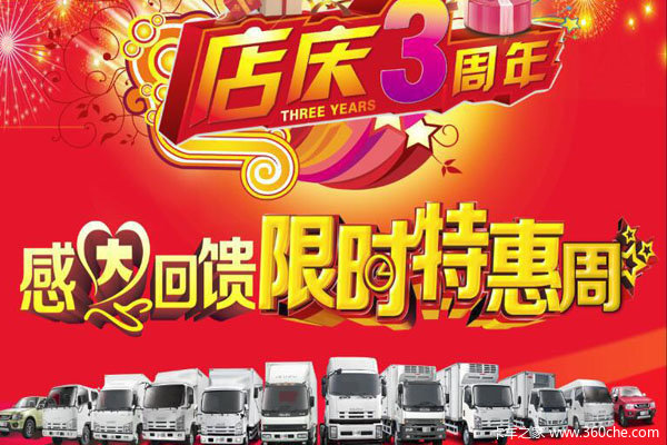 南京勤华庆铃3周年庆,到店即可疯狂享受特价优惠。这是一场限时优惠!这是一场感恩回馈周年庆!这是一场限时限量热卖会!时间有限,活动时间为2016年3月27日——2017年4月2日,只要你敢来,我们就敢优惠。