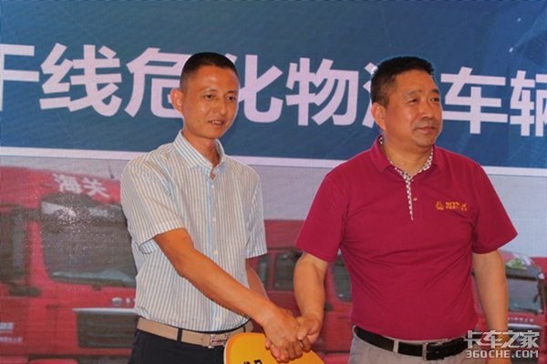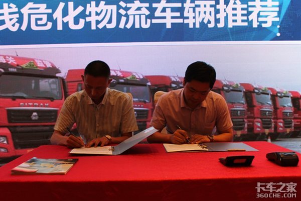 成都有缘酒业有限公司梁晋先生和中国重汽商用车济南商用车大客户经理刘毅现场签约6台汕德卡危险品车。