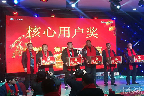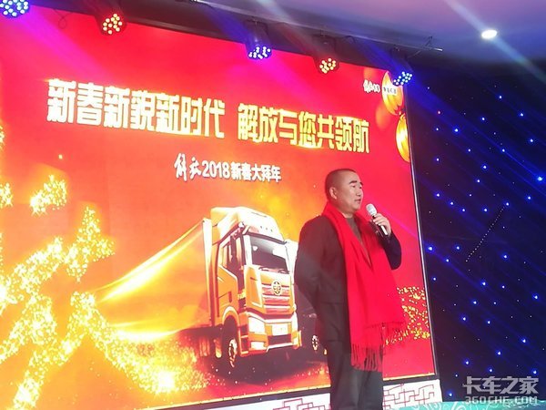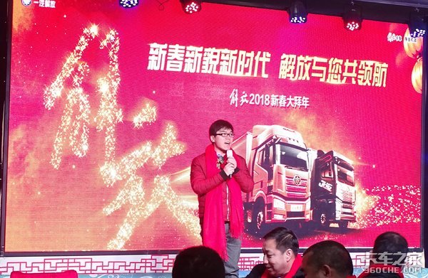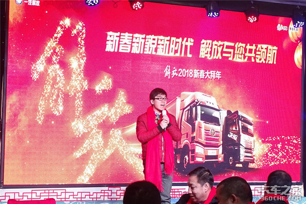 来卡车之家App【卡车之家 原创】2017年是一汽解放辉煌的一年,也是持续领航的一年。2017年一汽解放共销售卡车29.6万辆,位居行业第一,成为全国解放用户真正的“挣钱机器”。2018到来之际,一汽解放经销商山西致诚汽车贸易有限公司在2018年2月2日于江正大酒店举办了以回馈用户为主题的大型新年团拜会。