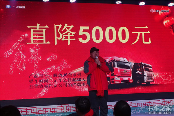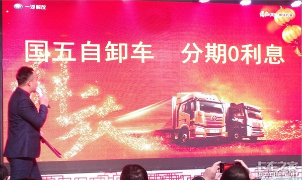 随后,销售经理高宇鹏宣布了当天的购车优惠政策:当天所有一汽解放车型直降5000元;国五自卸车,分期0利息。在如此大的优惠力度下到场的用户纷纷出手订车。