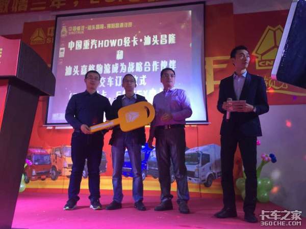 中国重汽豪沃轻卡部广东大区总经理周全先生、汕头市昌隆汽车销售服务有限公司总经理陈友绵先生上台将象征财富的金钥匙交付汕头市嘉格物流公司总经理邓文杰先生。
