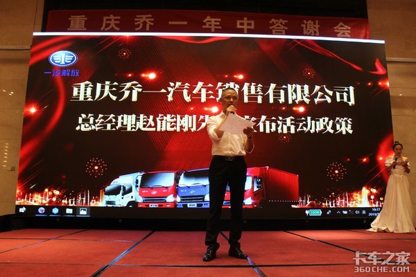 重庆乔一汽车销售有限公司总经理赵能刚先生上台致辞谨代表公司所有员工对活动现场来的领导、嘉宾及卡友们表示热烈欢迎,并祝愿在坐嘉宾及所有卡友们身体健康事事顺心!年年开解放轻卡年年挣大钱,让解放轻卡伴随您一生幸福永远!