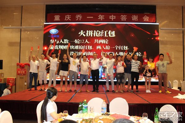 18:30由舞蹈《旗开得胜》开幕,主持人宣布活动正式开始!隆重介绍了本次活动参会的各方领导及特别嘉宾!本次出席晚会的领导嘉宾有:一汽解放发动机事业部营销服务部一部总监钱宇先生、一汽解放发动机事业部重庆分公司营销经理姜永林先生、一汽解放发动机事业部重庆分公司服务经理邹泉发先生、重庆乔一汽车销售有限公司总经理赵能刚先生及卡友们,共计300人左右。