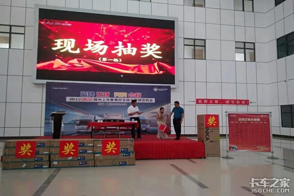 17:50 团购会结束,6台订车者孙总上台为卡友们抽取5名幸运得主,得奖者上台领奖由大区藏总亲自为得奖者颁奖并合影留念。后面由订车客户代表再次上台抽取10名幸运得主,得奖者满心欢喜 上台领奖,和大区臧总及赣州鸿明公司朱总一起合影留念!