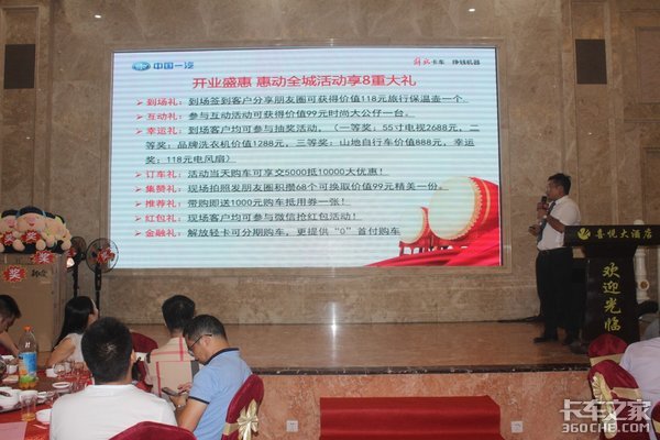 益华副总罗冬介绍本次开业活动献出八重大礼。到场礼:到场签到卡友分享朋友图可获得价值118元旅行保温壶一个。互动礼:参与互动活动可获得价值99元时尚大公仔一个。幸运礼:到场客户均可参与抽奖活动,(一等奖:55寸电视2688元,二等奖:品牌洗衣机价值1288元,三等奖:山地自行车价值888元,幸运奖:118元电风扇。)订车礼:活动当天购车可享交5000抵10000大优惠。集赞礼:现场拍照发朋友图集赞68个可換取价值99元精美一份。推荐礼:带购即送1000元购车抵用券一张!红包礼:现场客户均可参与微信抢红包活动!金融礼:解放轻卡可分期购车,更提供“0”首付购车。
