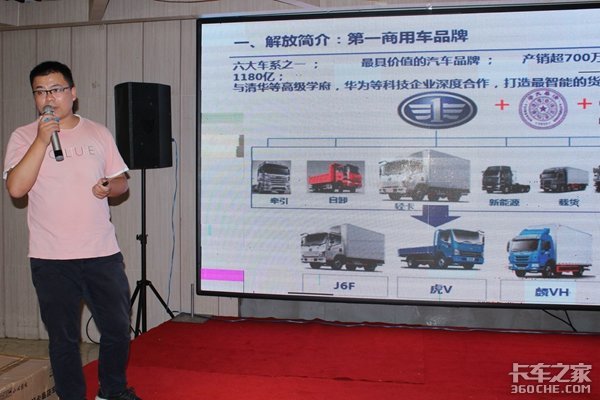 一汽解放青岛汽车销售有限公司江苏商代处销售经理李晓东先生作现场产品介绍。李经理向嘉宾们介绍一汽解放轻卡2019年最新款车型。从配置、性能、服务等方面让现场的嘉宾们了解一汽解放轻卡产品的优势之所在。