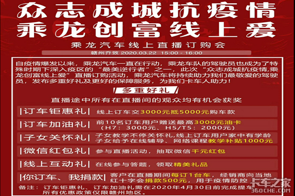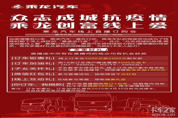 来卡车之家App【卡车之家 原创】疫情无情·人有情,东风有礼 柳汽带您看直播!2020年3月22日下午15:00-16:00,赣州乔致汽车贸易有限公司 将举行乘龙汽车线上直播订购会,诚挚邀请您参加。专业的明星车型介绍,丰厚的六重订车大礼,下不停的红包雨,还有现场订车优惠、各种精美礼品!等您来抢!欢迎各位朋友扫描下方图片二维码进行订购!今天下午 让我们一起 相约“线上直播”订购会 期待!