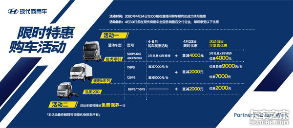 活动条件:4月30日前在现代商用车全国各销售店交付定金即可享受以上优惠。