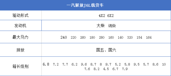 J6L有4X2和6X2两种驱动形式,发动机可选大柴、锡柴,最大马力段覆盖140-320不等,并有多种货箱形式可供选择。