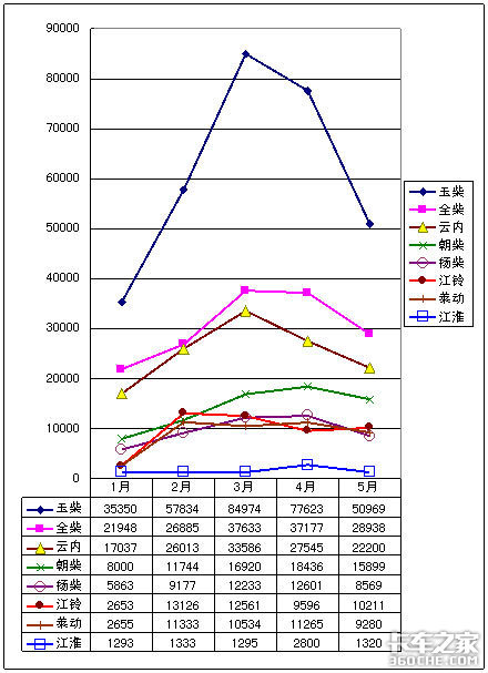 从企业的情况看,规模最大的柴油机企业玉柴集团本部生产的四缸柴油机,只有YC4F排量在3升以下(2.6升),其余均在4升以上,明显偏大,而YC4F是玉柴高端机型,主配轻卡。所以,玉柴1~5月份销售的小马力柴油机有相当比例是由玉柴在湖北、厦门等外地工厂生产的单缸或双缸柴油机。进入3、4月份之后,在轻卡与农机市场滑坡的双重影响下,玉柴的下降幅度非常大。而其他企业,如全柴、扬柴、莱动等,配套农机的比例很高,所以,轻卡市场2月份走低时,这几家企业的柴油机靠农机市场的支撑仍保持了相对平稳的态势。自3月份之后,农机市场的高潮渐渐消退,莱动、扬柴、全柴等企业的增幅也开始呈下降之势。