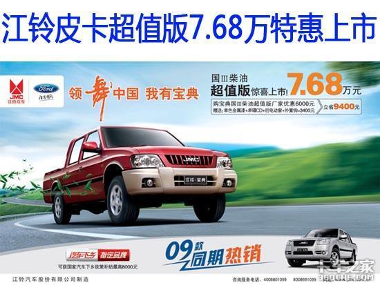7月1日,售价仅为7.68万元的江铃宝典超值版在海南江铃汽车销售有限公司隆重上市。此车的上市是为配合2010年汽车下乡的延续,亦是江铃汽车继之前7.98万后再次给消费者带来超值优惠。此举不仅将国Ⅲ高端柴油皮卡的价格,从8—9万元再次拉进7万元区间,还破解了市场需求和价高难下的僵局,填补了7万元的高端柴油皮卡的空白,使更多的消费者能够享受到高品质性能的产品。