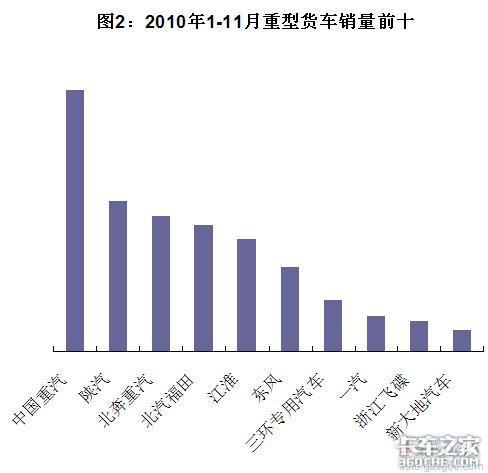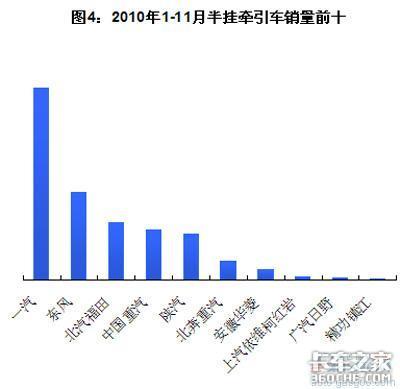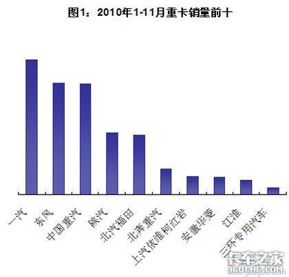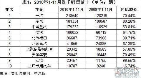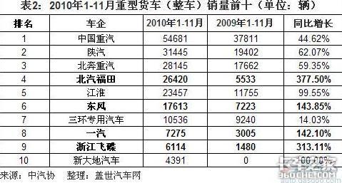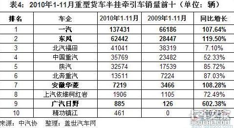 2010年1-11月,中国重卡(含整车、非完整车辆和半挂牵引车)销量同比大增64.45%至94.18万辆。其中,重卡整车和半挂牵引车的销量增长率最高,分别同比增长87.68%和79.42%,至22.63万辆和33.41万辆。重卡非完整车辆(指底盘)增速最低,为43.44%,但总量在三个子类中仍最高,为38.15万辆。