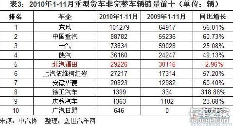 今年1-11月,北汽福田的重卡非完整车辆销量同比下降2.96%至2.92万辆,是重卡非完整车辆销量前十企业中唯一一个出现负增长的企业。一汽也仅增长25.08%至7.38万辆。