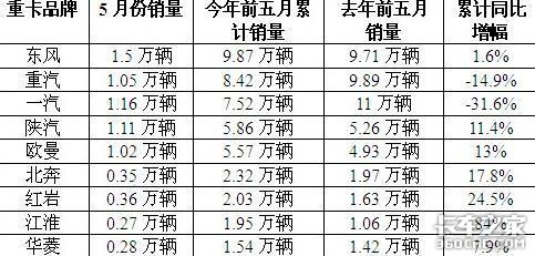 5月过后,东风以前五月9.87万辆的数据,继续蝉联2011年重卡销量排行榜第一,而且保持了同比小幅增长的态势,十分难得。第二集团军和第三集团军保持了累计销量同比增长的趋势,以江淮和上汽依维柯红岩增幅最大,分别达到84%和24.5%。