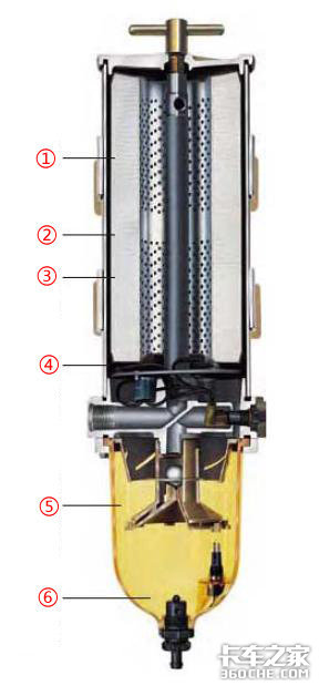 当燃油流经过滤器涡轮时,在离心力的作用下,较大的颗粒物和水珠与燃油分离,由于水的比重大于燃油,水会沉到集水杯底部;