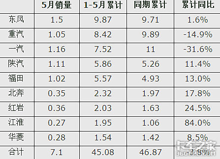 5月份,重卡市场单月销售7.4万辆,同比下降约31%,环比下降约30%。这使得本来1-4月还保持略微增长的重卡市场发生大逆转,1-5月重卡累计销量45万辆,同比下滑约4%。其中,主要的9家企业销量见下表:(单位:万辆)
