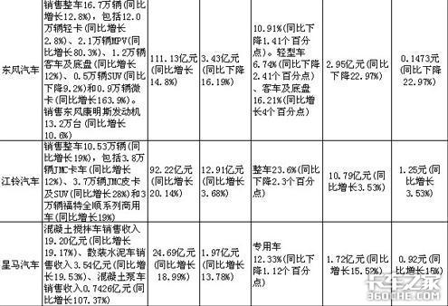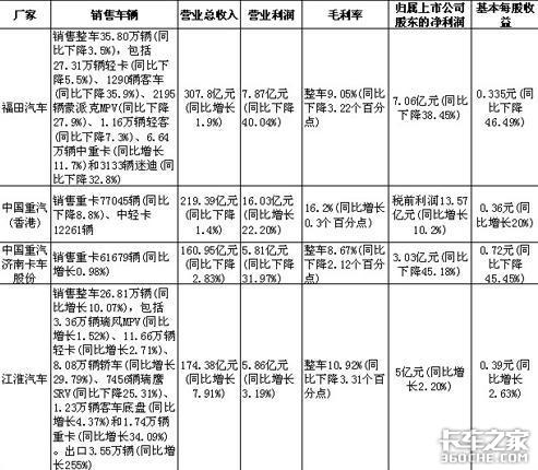 例如,福田汽车上半年销车35.8万辆,同比下降3.5%,整车毛利率下降3.22个百分点,净利润7.06亿元,同比大降38.45%;江淮汽车上半年营收增长了7.91%,但整车毛利率下降了3.31个百分点,净利润只微增了2.2%(5亿元);江铃汽车虽然营收增长20%,但净利润只增长了3.53%(10.79亿元),整车毛利率下跌了2.3个百分点;东风汽车营收增长较快(14.8%),但净利润同比下降了22.97% (2.95亿元)。曙光汽车的车桥业务受卡车市场下滑和原材料价格上涨拖累,毛利率下降了1.63个百分点。即便是上半年总体业绩相对不错的星马汽车,毛利率也降低了1.12个百分点。