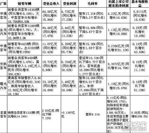详细来看,宇通、曙光和金龙主要是国内业绩抢眼。宇通上半年出口同比一度下滑, 但国内销量增长迅速,2011年1-6月,宇通累计销售客车18368辆,同比增长8.16%,公司大型、中型客车分别增长18.78%和8.89%,均超过行业平均增幅。除了毛利率受原材料和人工成本上涨影响,微降0.2个百分点之外,宇通客车的其他指标(营收、营业利润、净利润、每股收益)都超过两位数增长。