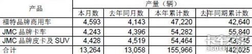 产量上,1—10月福特品牌轻客累计产量达4.72万辆,同比增长10.74%;JMC品牌轻卡累计产量达5.43万辆,同比下降2.79%;JMC品牌皮卡及SUV产量达5.45万辆,同比增长25.1%。