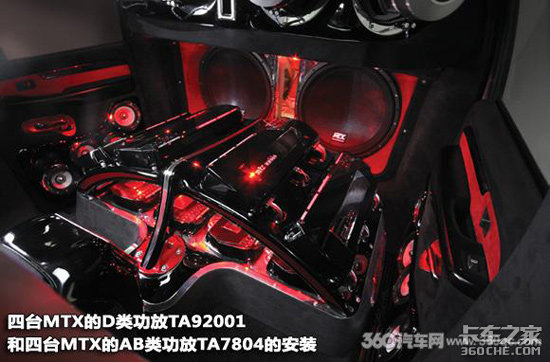 有着如此庞大的超低音系统,功放方面的选择也不容忽视。这个音响系统一共用了八台功放,分别为四台MTX的D类功放TA92001和四台MTX的AB类功放TA7804。TA92001是MTX Thunder系列超级功放,外型有个可选式的灯光颜色调整功能。在1ohm的情况下功率可以达到3000W,由此可以看出,四台TA92001功放是主推超低音T9922的。而TA7804为MTX具有专利类的AB类功放,有着热调节涡轮增压风扇冷却器,和过载过热保护等。在1ohm的情况下,功率可以达到800W。