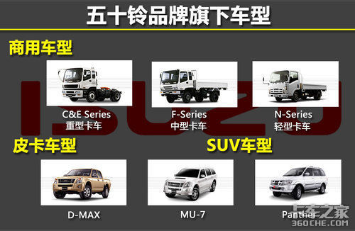 现在五十铃品牌在日本拥有商用车型和皮卡车型,其中更多的将精力放在商用车型部分,旗下有N系列轻型卡车、F系列中型卡车、C&E系列重型卡车,此外还有皮卡车型D-MAX。而在SUV车型上五十铃现在有两款车型,型号分别为MU-7、Panther,而未来这两款车型将在新的合资公司成立后投产。