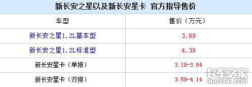 2012年10月24日,新长安之星正式上市,新车共推出一个排量两款车型供消费者选择,售价区间为3.89-4.39万元。同时,新长安星卡单排/双排车型的售价也同时发布了出来,售价区间分别为3.19-3.84万元和3.59-4.14万元,有关新车具体售价请您查看以下图表: