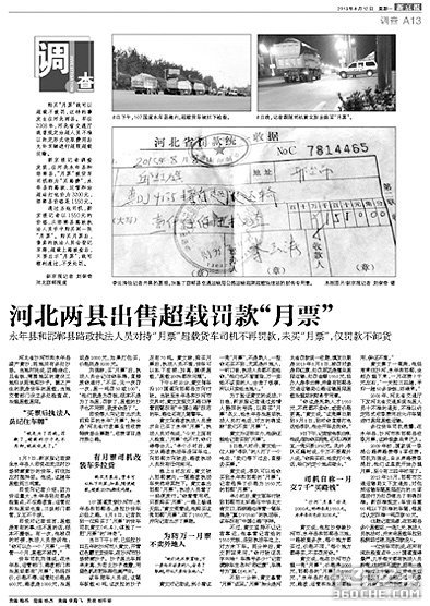 超载上路不被罚 河北两县售"超载月票"