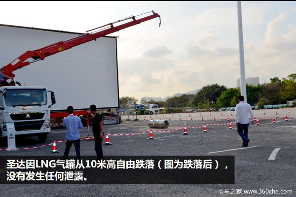 圣达因的LNG气罐从10米高的地方自由跌落并没有发生任何泄露,小编也在现场看到了装备圣达因气瓶的重汽车型。